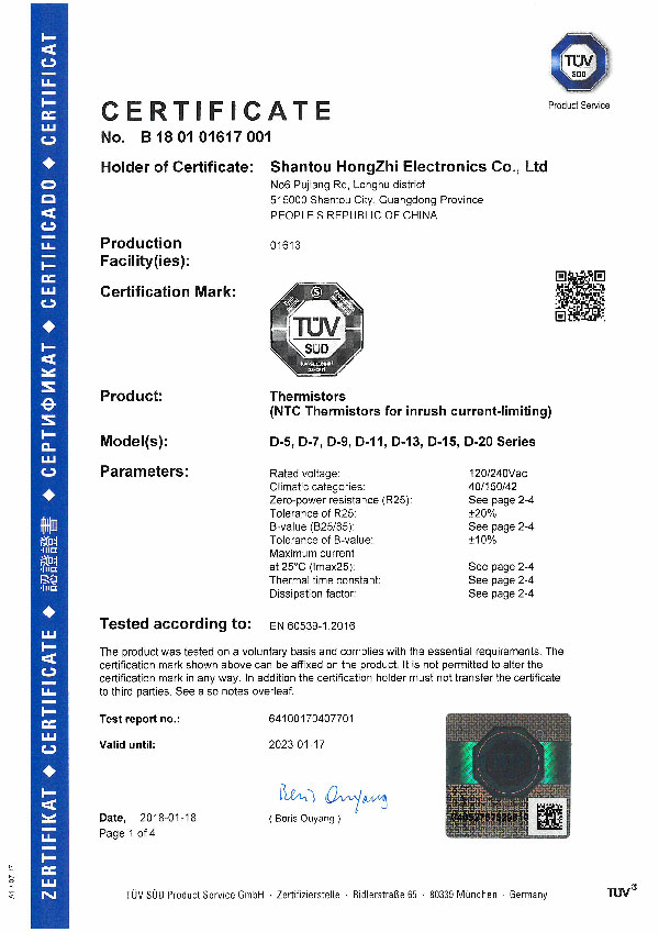 2018年1月,汕頭市鴻志電子有限公司生產的NTC熱敏電阻獲得德國TUV認證;至此我司熱敏電阻共有德國TUV.美國UL.中國CQC和美國CUL四個認證。